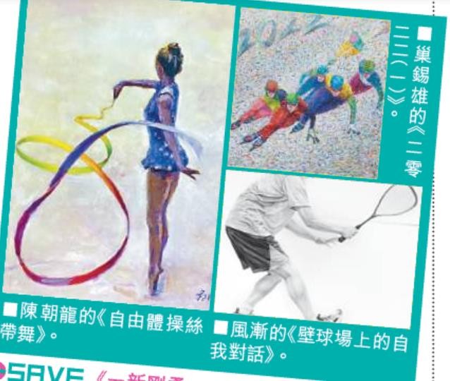 其中,畫家風漸以繪畫探索人類 的思想和情感,其筆下的黑白素描, 畫面冷靜但暗藏張力,人物專注專 的神采。馬銓的《衝浪》,呈豐富層次 的蔚藍海浪畫面,美麗奪目。陳朝龍 的《自由體操絲帶舞》,着色均勻,讓自由體操絲帶舞運動員的舞姿鮮活起來。各式運動各有獨特姿態。