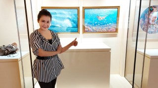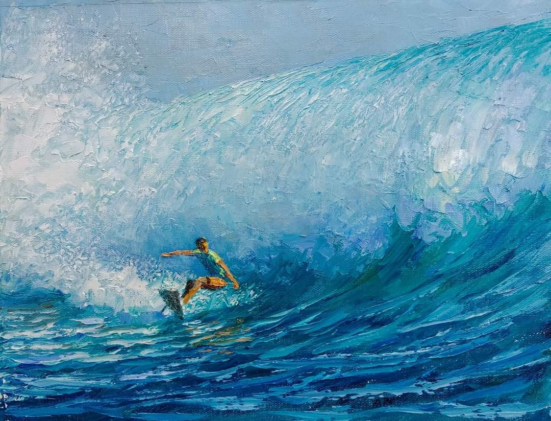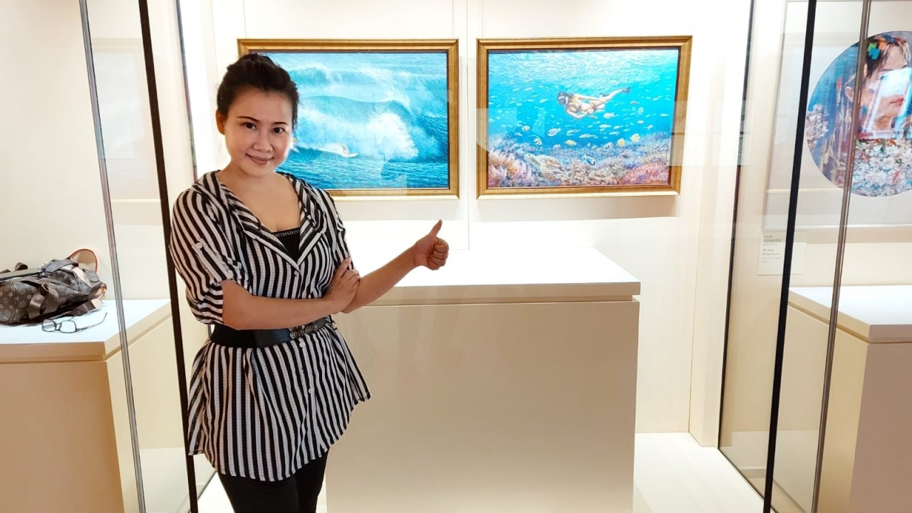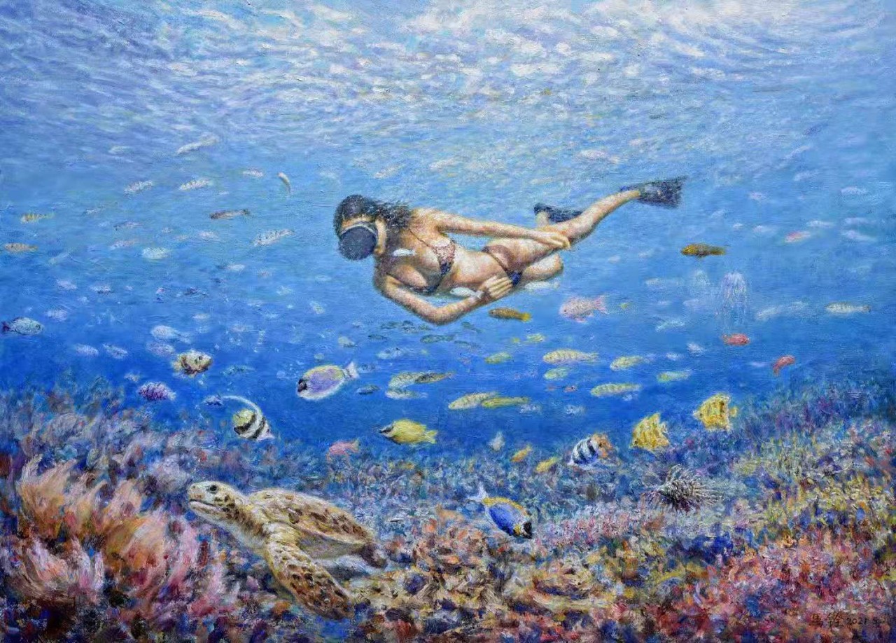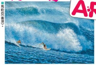 其中馬銓的《衝浪》,呈豐富層次 的蔚藍海浪畫面,美麗奪目。