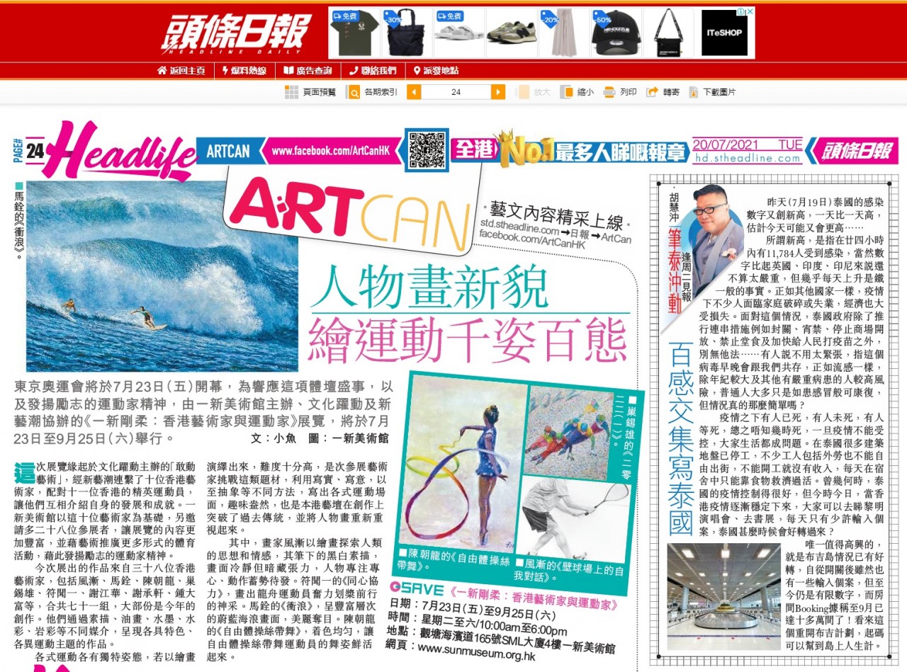 東京奧運會將於7月23日(五)開幕,為響應這項體壇盛事,以 及發揚勵志的運動家精神,由一新美術館主辦、文化躍動及新 藝潮協辦的《一新剛柔:香港藝術家與運動家》展覽,將於7月 23日至9月25日(六)舉行。
